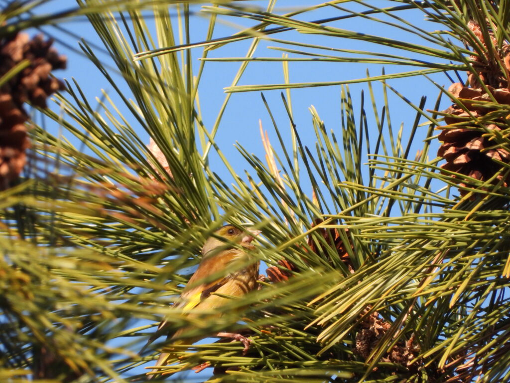 少し歩くと松の木の上にカワラヒワがいました。
