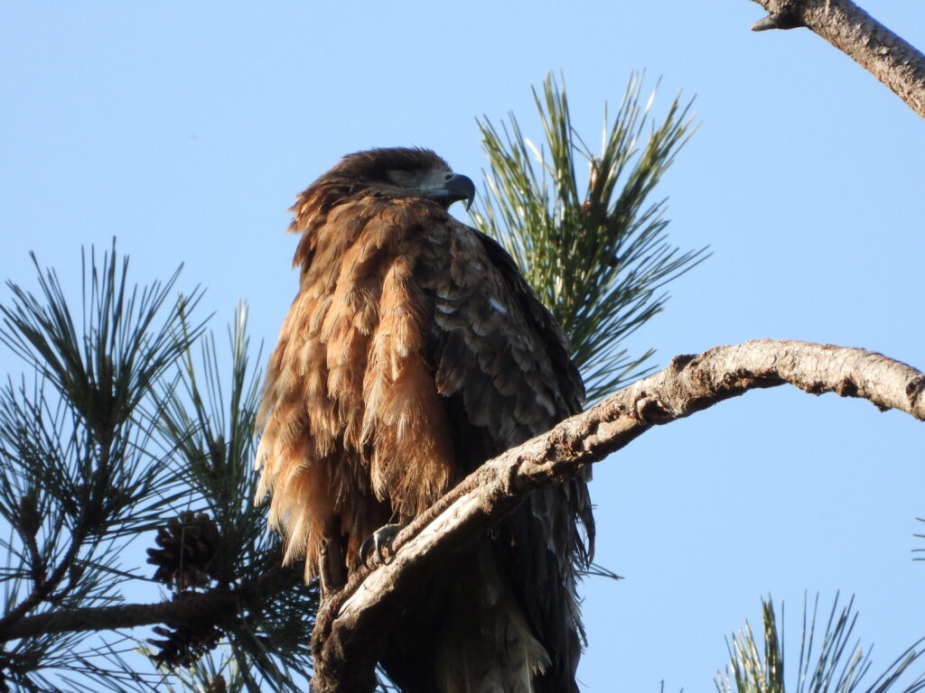 空を見るとトビが空から降りてきたのが見えたので足早に留まった木の方に向かい留まっているところを撮影できました。