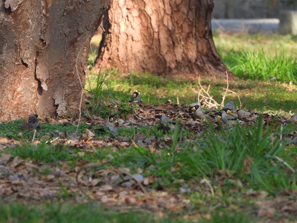 木の上ばかりに気を取られていたのですが木の下でイカルの群れが餌をついばんでいるのを見つけました。
