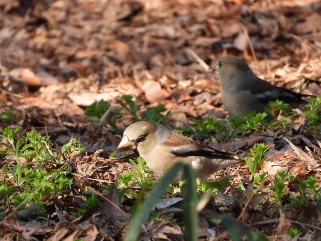 イカルとは少し離れてシメも少し申し訳なさそうに餌を探していました。